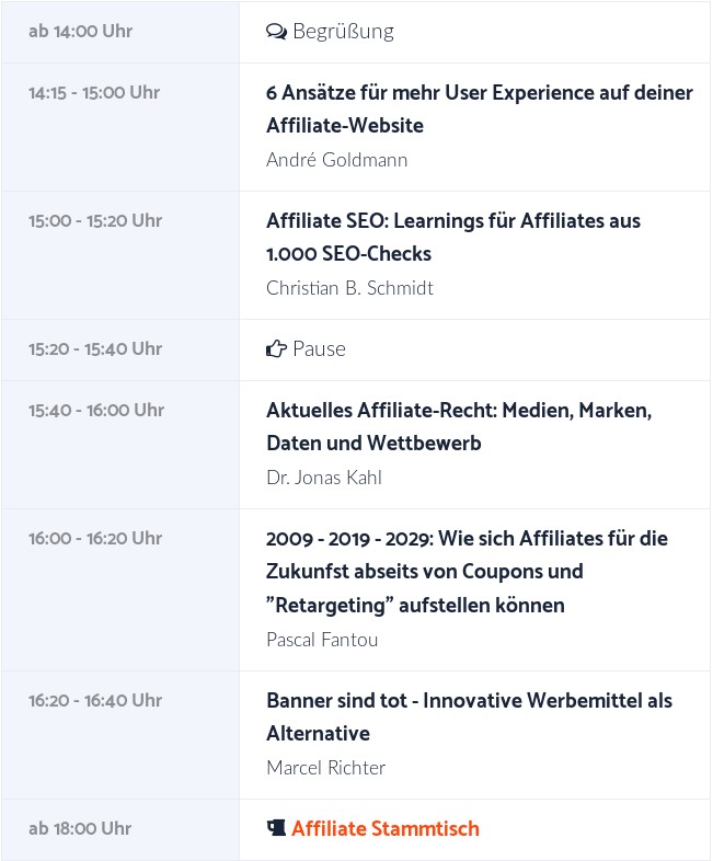 Im Vorfeld des Stammtischs in der Mortizbastei, wird es auch 2019 zum eine Konferenz mit spannenden Vorträgen für Affiliates geben. Im Rahmen dieser gibt es ab 14:00 Uhr sechs spannende Vorträge von ausgewählten Branchenspezialisten.