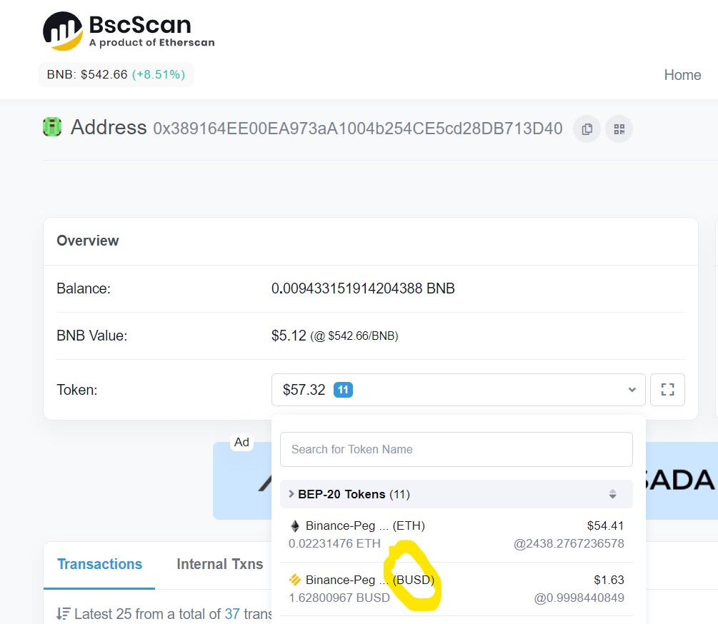 Tipp 3: Wenn in MetaMask eine Kryprowährung(Coin) nicht angezeigt wird, ist das nicht schlimm, da die „Yield Farming Optimizer“ das automatisch erkennen. Und in der Blockchain finden sich alle Werte auch: Einfach in MetaMask rechts oben auf die 3 Punkte neben „Account 1“ klicken, dann „View in Explorer“ und dort auf die Aufklappliste „Token:“ klicken. Siehe folgendes Beispiel mit „Token: $57.32 11„: