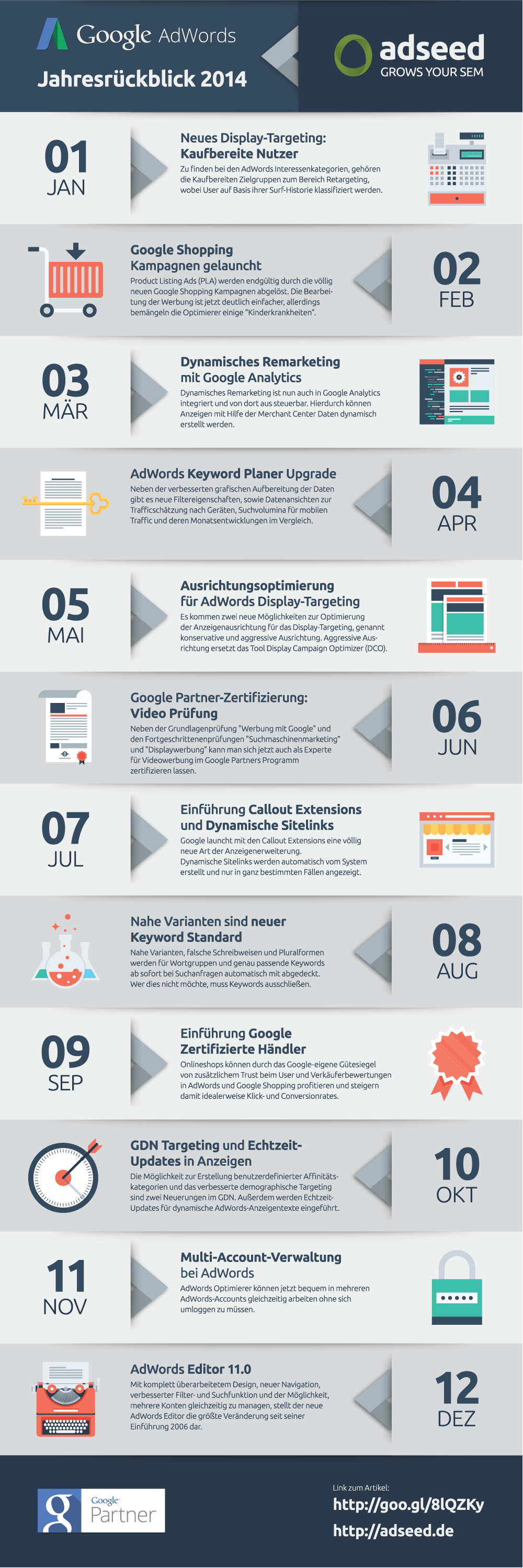 Jörg Ulrich von adseed hat die Entwicklungen von Google Adwords 2014 vorgestellt. Er hatte die Details bereits verbloggt und bei uns mit einem Blick in ein Live-Konto erklärt. Ihr könnt die Details zu allen Entwicklungsschritten hier nochmal nachlesen. Wer fragen hat, kann Jörg ja auch direkt anschreiben. Die E-Mail Adresse steht unter dem Artikel. Hier nochmal die schmucke Infografik: